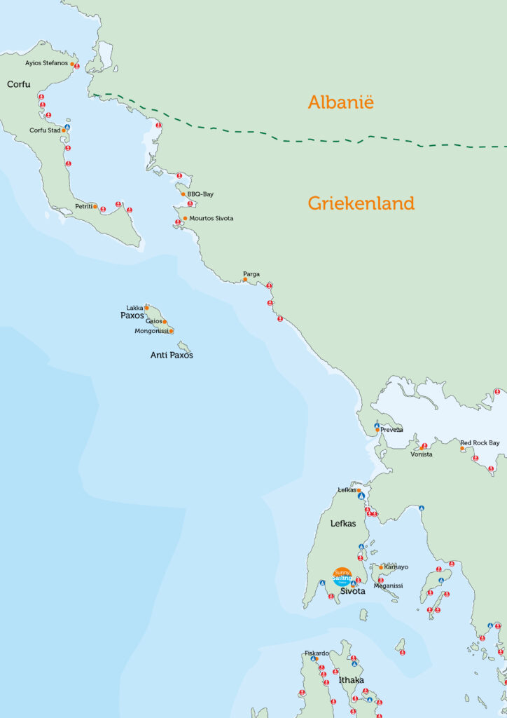 Vanuit Sivota varen we naar verschillende mogelijke bestemmingen in de Ionische Zee. Welke plaatsen precies worden bezocht, hangt onder meer af van de routeplanning, weersomstandigheden en de samenstelling van het flottielje.