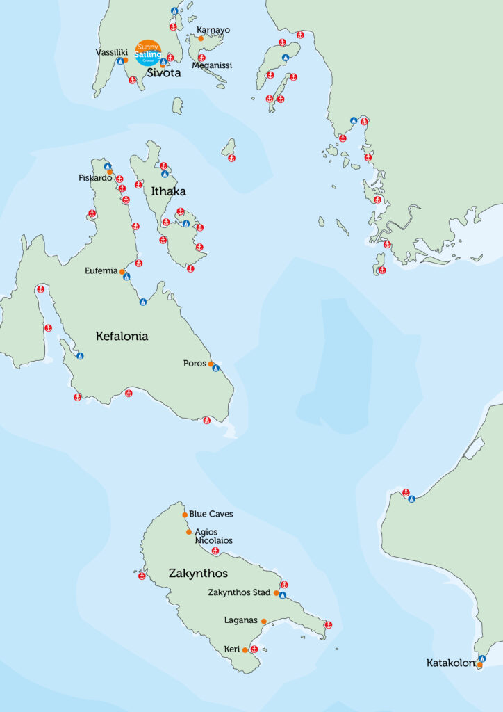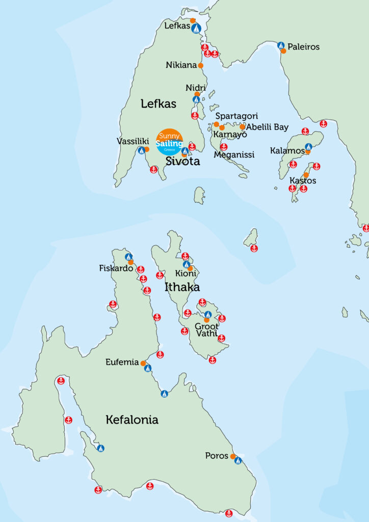 De Zakynthos 2-weekse flottielje start en eindigt in het sfeervolle Sivota op Lefkas. Deze beschutte baai vormt een fijne en veilige uitvalsbasis voor onze vloot. Langs de kleine haven liggen diverse gezellige vistavernes en restaurants. Onze aanlegsteiger wordt beheerd door Theo, eigenaar van restaurant 12 Gods, dat tevens dienstdoet als uitvalsbasis voor briefings en gezamenlijke diners.
